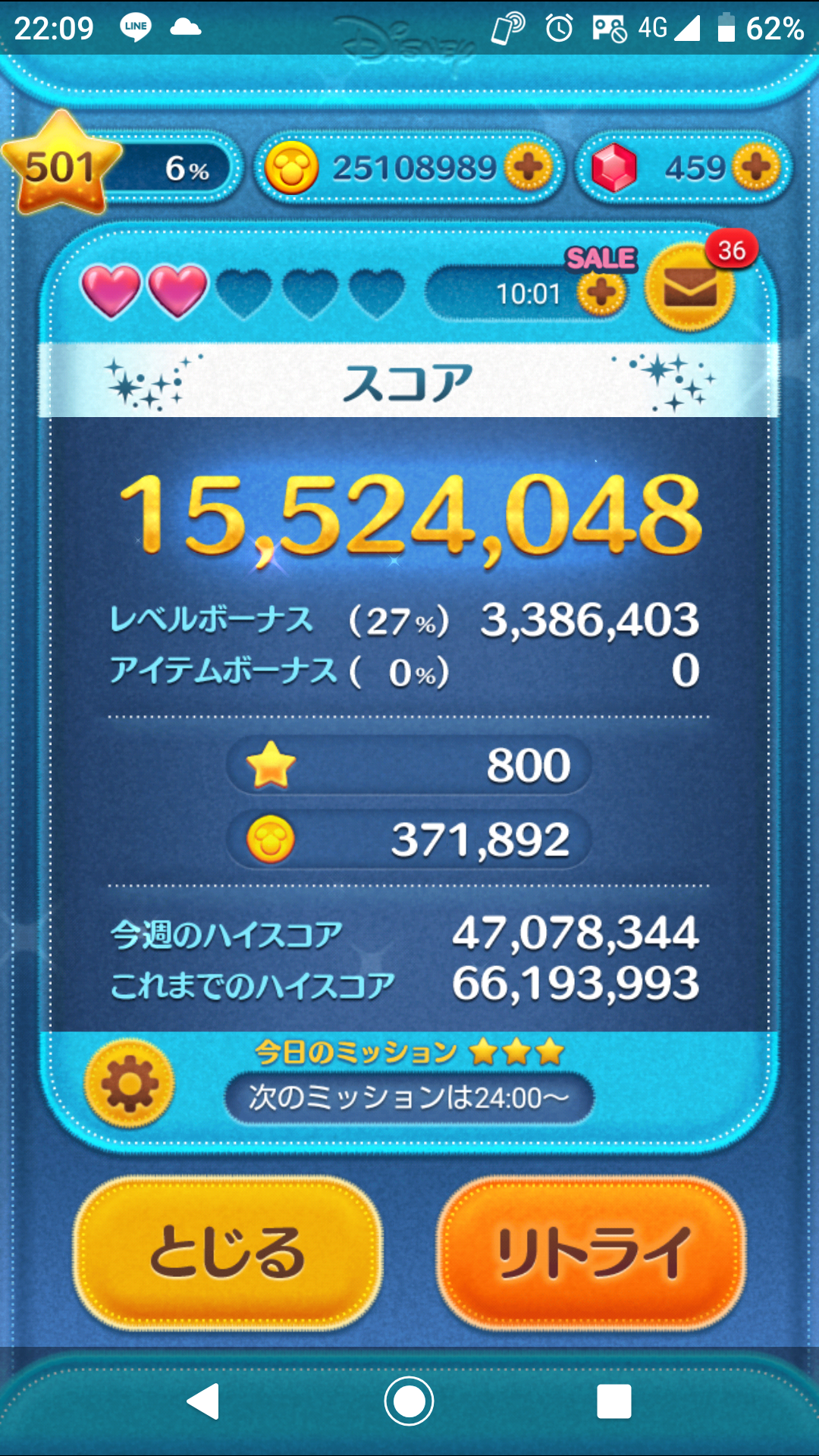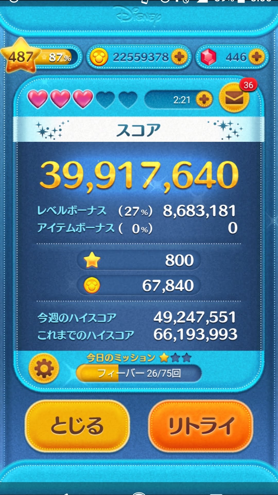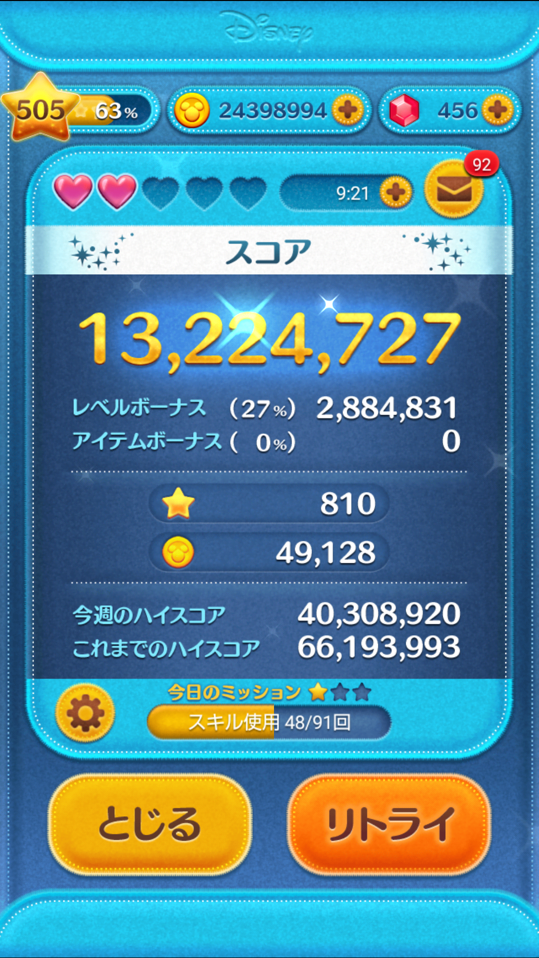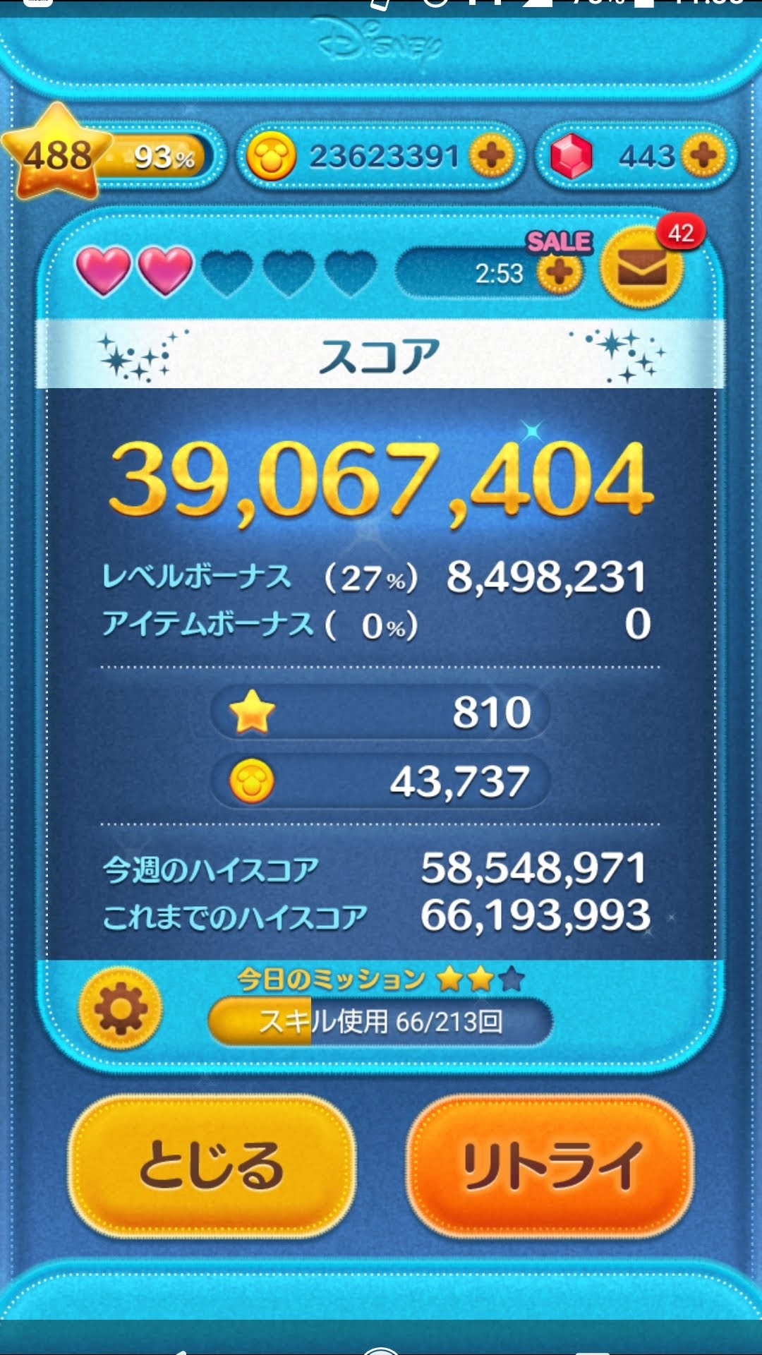 ちなみに使用ツムはジェダイルークで素コインが14000枚ちょっとだったかな?最近はこれ一択。