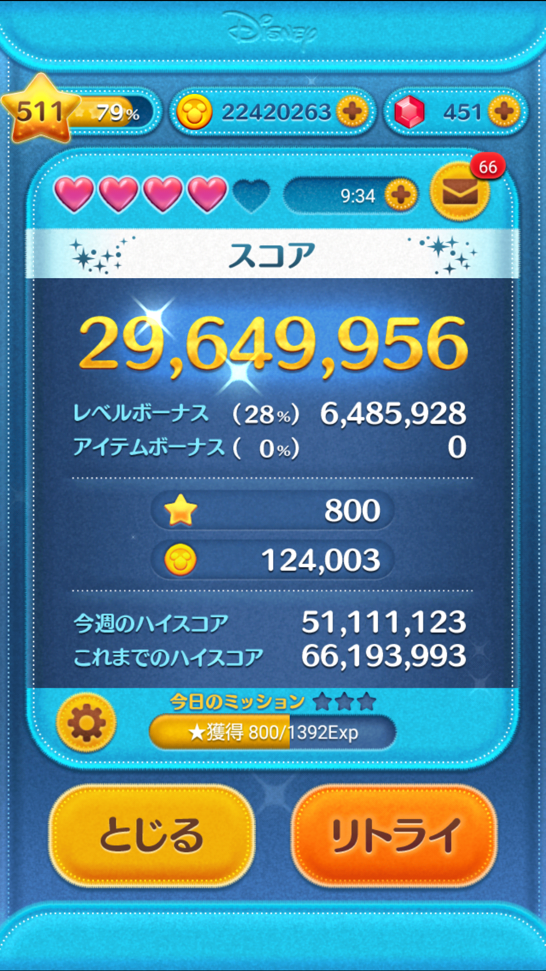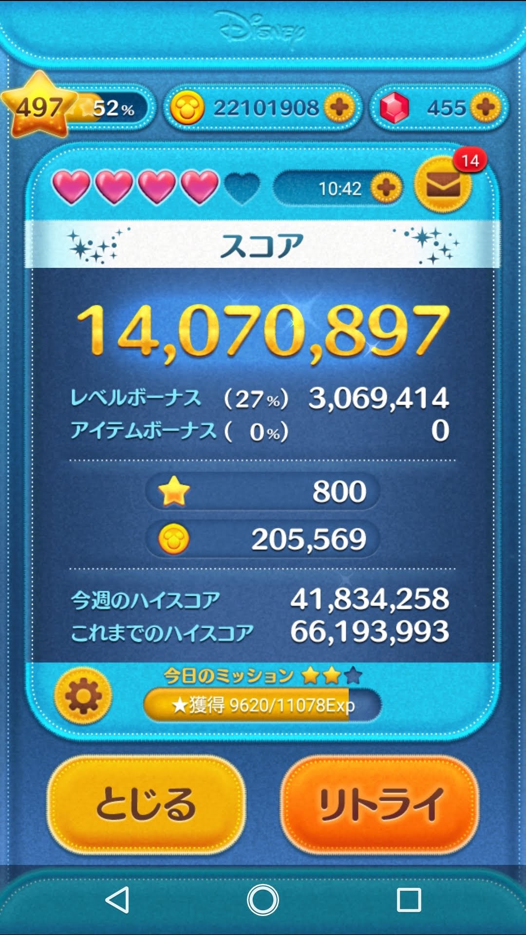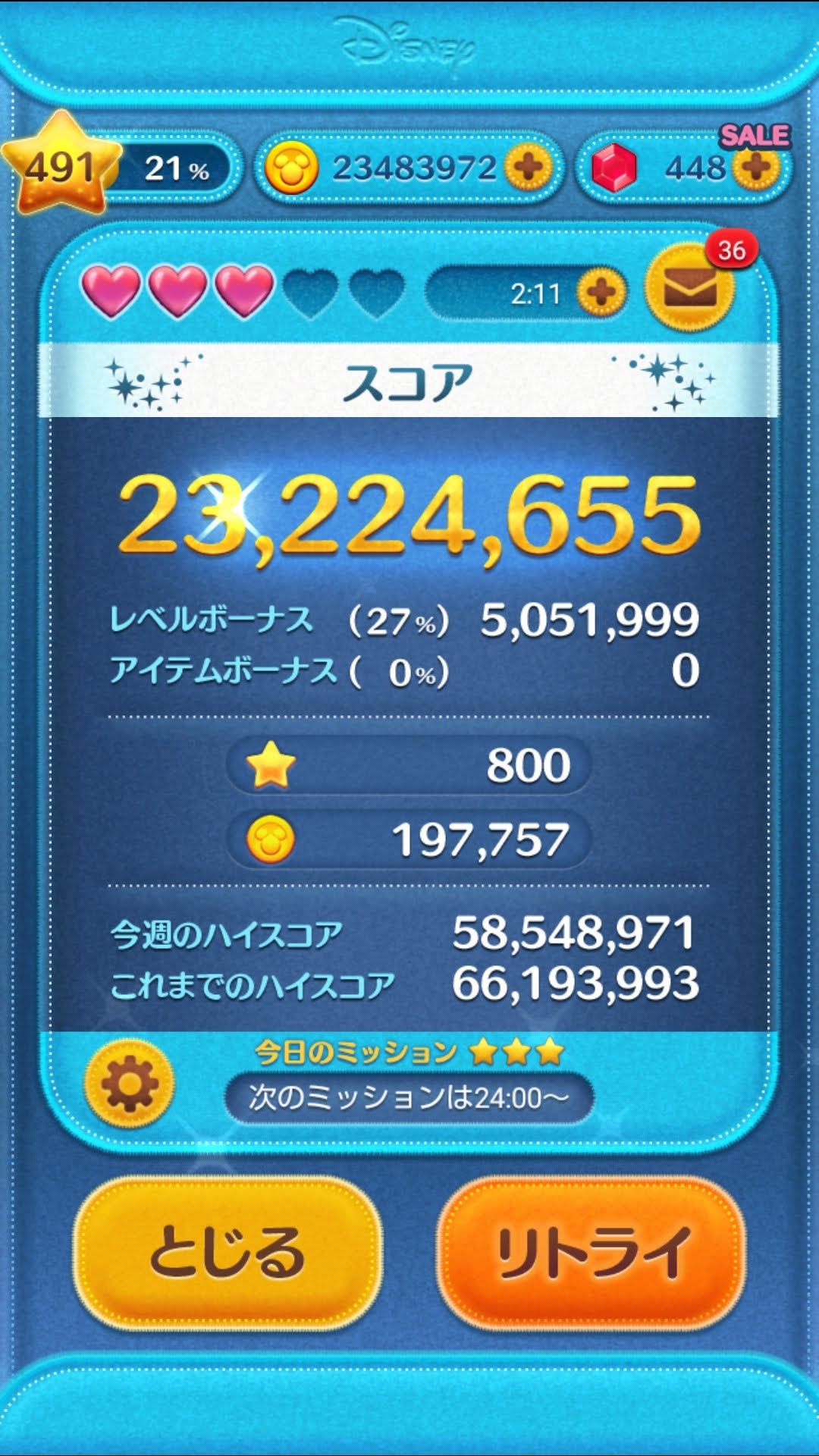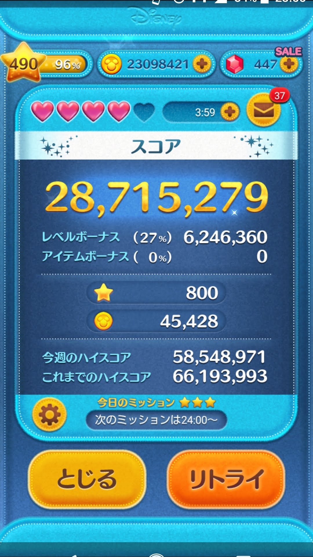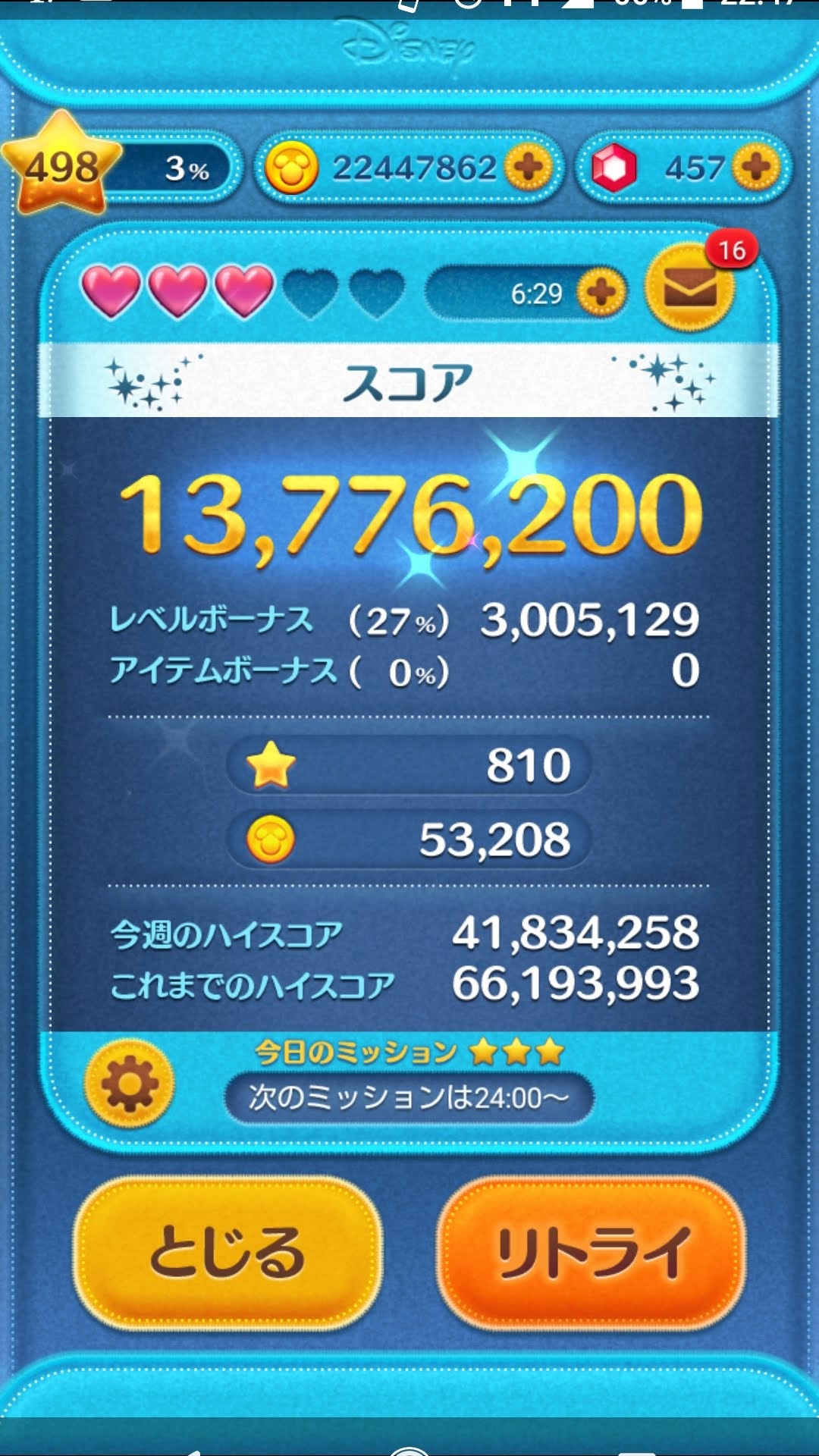ちなみに使用ツムはジェダイルークで素コインが14000枚ちょっとだったかな?最近はこれ一択。
