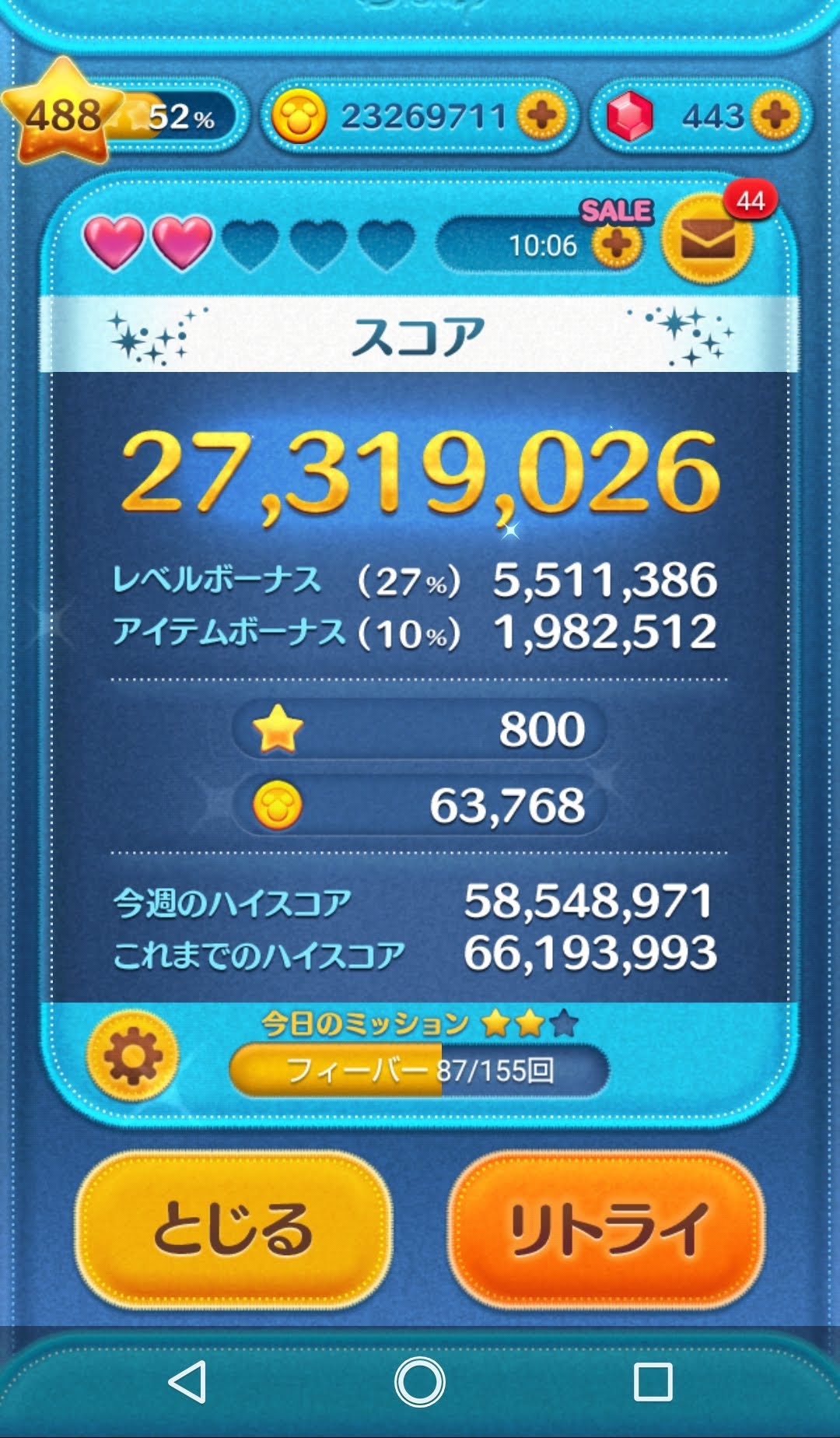 何も考えずにただ永遠に降ってくるツム達を消し続ける、、、。はたから見たらひたすらケータイの画面をなぞり続ける廃人だって思われても仕方ないけど、、、まぁ、実のところ廃人みたいなもんだし否定しないけどね~‼(*´Д`)