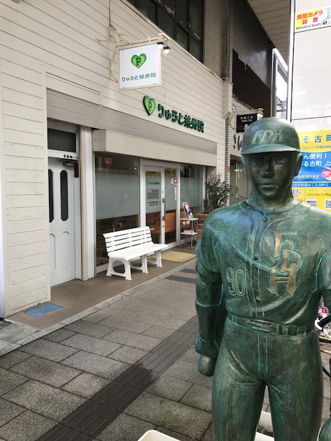 古町のドカベンストリートにあります。写真の銅像はあぶさん(景浦選手)