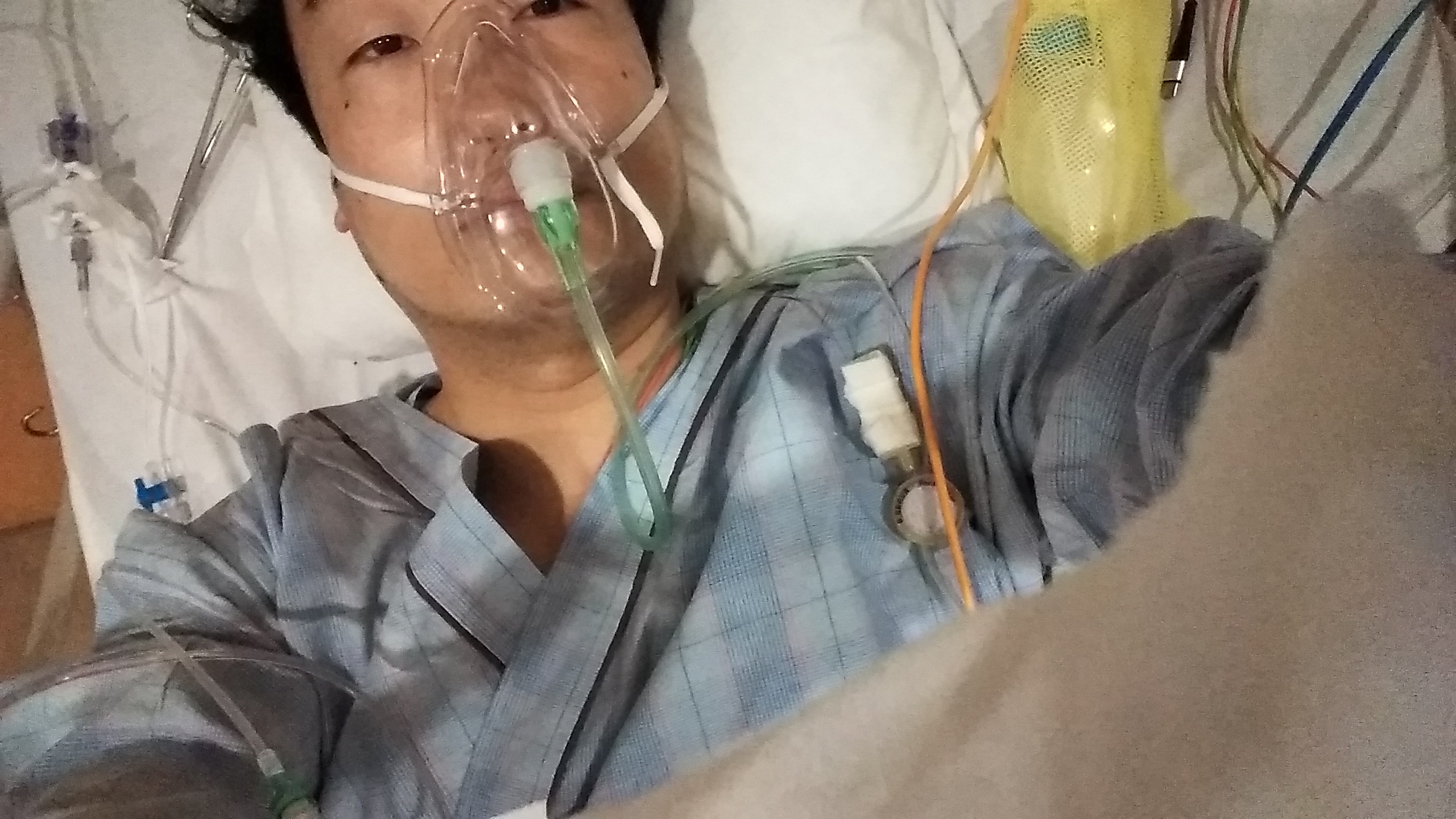 両腕と背中、お腹とおちん○んにそれぞれ管が差し込まれているのであまり、、というかほとんど動けない、、、。口には酸素マスク付いてる。。