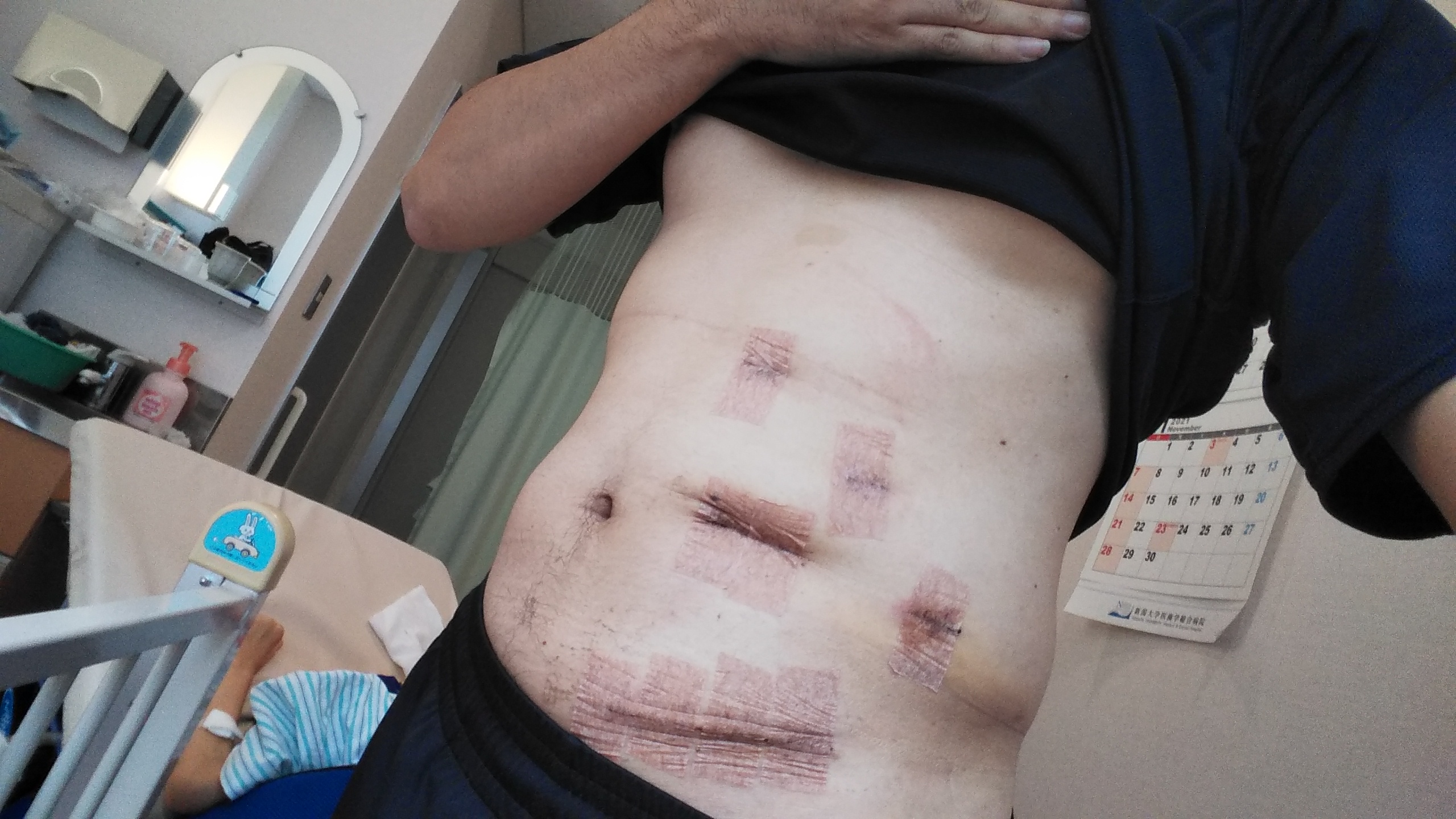 ドレーンと呼ばれるお腹に溜まった血を排出する管が抜かれる。そこそこ太いのと細いのが3本。先生に引っ張られて抜かれたけど、内臓も引っ張られてる感じで気持ち悪かった。。