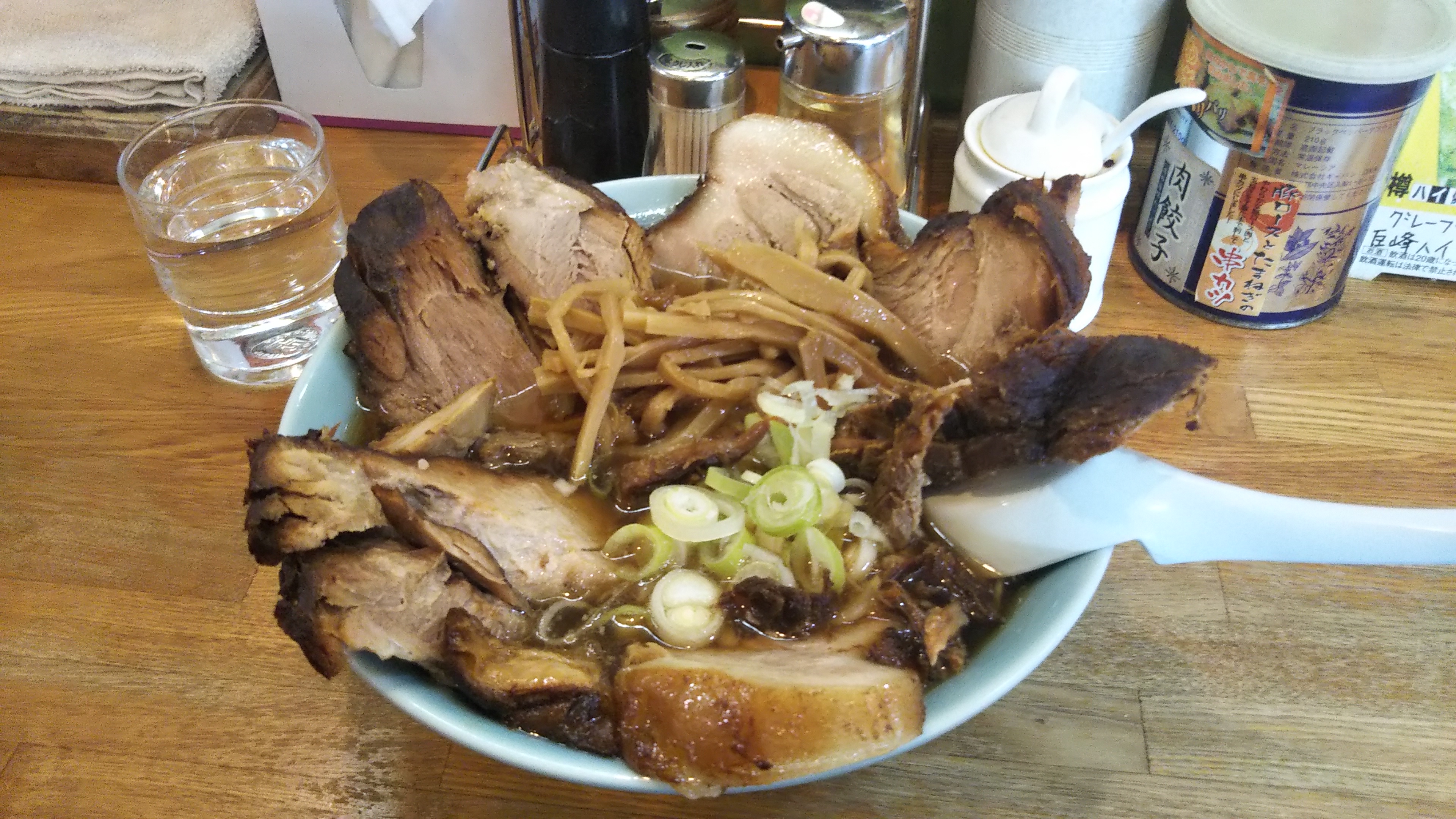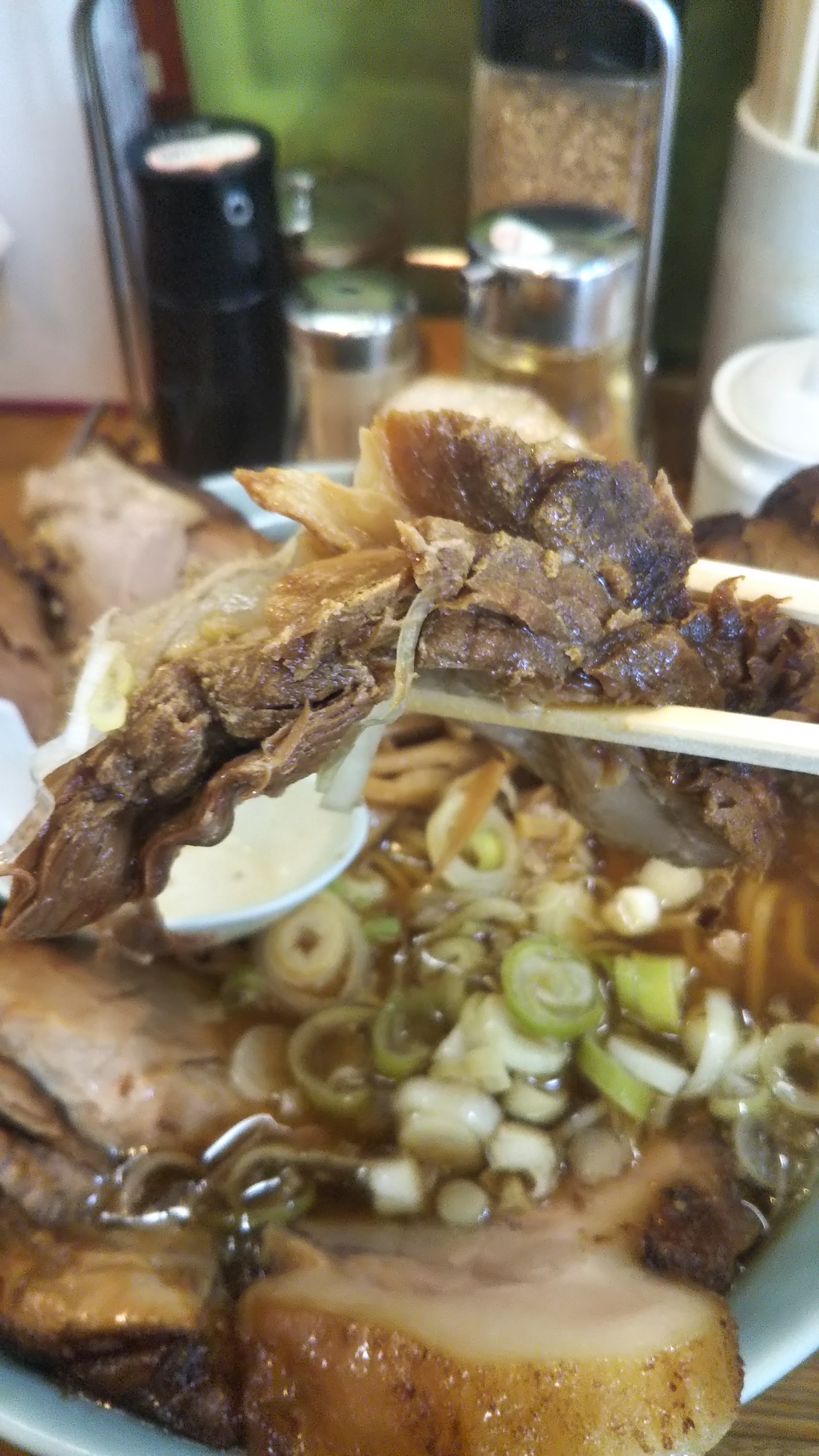 普通のラーメン屋さんのチャーシュー麺ならこの一枚を薄切りにしても十分な量だと思うけど、見ての通りそれが鬼盛りだよ(´ω`)